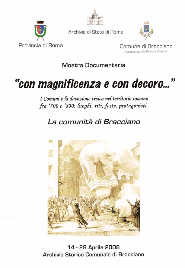 Con Magnificenza e con decoro. I Comuni e la devozione civica nel territorio romano tra '700 e '800: luoghi, riti, feste, protagonisti. La comunità di Bracciano. Catalogo locale della mostra tenutasi presso L'Archivio Storico Comunale di Bracciano (14-28 Aprile 2008). Tipografia Copyland, Bracciano.