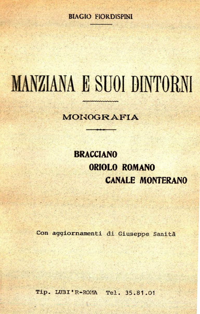 Disponibile presso la Biblioteca Comunale di Bracciano e sul sito web: http://www.scribd.com/doc/141136642/Fiordispini-1908-Manziana-e-i-suoi-dintorni-Monografia-Bracciano-Oriolo-Romano-Canale-Monterano